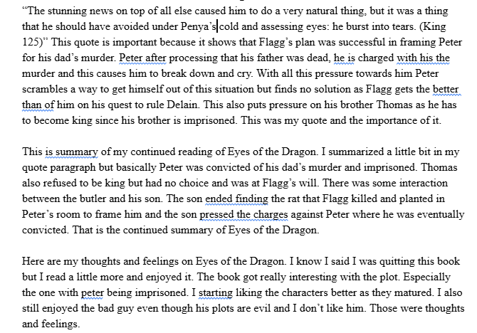 My interest in literacy did not really start until the 8th grade, which was my first chance to write and read texts in a meaningful way. My first attempts at writing were met with some tough feedback. I was told my writing felt unprofessional, and that this kind of sloppy writing would not fly in high school. This feedback filled me with despair, it made me feel like reading and writing were just not my thing, that I had no talent for literacy. It took quite a bit of reflection for me to realize I was not meant to be great at this yet. Much like the name of the project, literacy is a journey, and I was just really at the beginning. If I would have stopped now I would have missed out on engaging with some of my favorite classes and novels. This is when I knew I had to just keep trying and the results would come eventually. Of course, just as I began to start enjoying literacy quite a bit, the Covid pandemic took over and suspended my ability to engage with it. This was probably the most challenging point in my life as far as development. I did not have school to rely on, so I realized it was time to take this journey upon myself. The first full-length novel I read was The Long Walk by Stephen King. This book had a profound effect upon my life; it showed me the great ways literacy can be used to affect a larger group of people. So, once school commenced again, I began writing about the novels I was reading. Though I thought my writing was excellent in 8th grade, it was clear I had many things to improve on.
